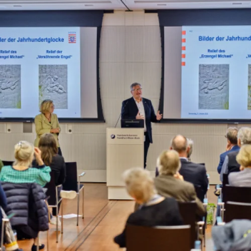 Vortragsveranstaltung am 5.10.2023 in Kooperation mit der Handwerkskammer Frankfurt-Rhein-Main. Vortrag von Dr. Alexander Jehn, Direktor der Hessischen Landeszentrale für politische Bildung. Die Geschichte der Paulskirche hat viele Facetten. Eine davon betrifft fünf Kirchenglocken, die 1948 im Rahmen des Wiederaufbaus gestiftet wurden und vom Glauben an den gesamtdeutschen demokratischen Neubeginn Zeugnis ablegten.