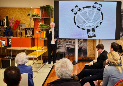 Zur Frage „Wofür braucht die Paulskirche ein Haus der Demokratie?“ referierten und diskutierten im Frankfurter „Massif Central“ Sophie Bauersachs, Schülerin, Bundessiegerin Jugend debattiert 2021, Stephanie Hartung, Mitgründerin und Vorstand von Pulse of Europe e.V., Nikolaus Hirsch, Architekt, Kurator und Publizist, Direktor CIVA Museum Brüssel, Prof. Helmut Kleine-Kraneburg, Gruber + Kleine-Kraneburg Architekten, Carsten Knop, Herausgeber Frankfurter Allgemeine Zeitung, Dr. Stefan Ruppert, Vorstand Personal & Recht, B. Braun Group, Prof. Dr. Mirjam Wenzel, Direktorin Jüdisches Museum Frankfurt, Mitglied der Expertenkommission „Paulskirche und Haus der Demokratie“.