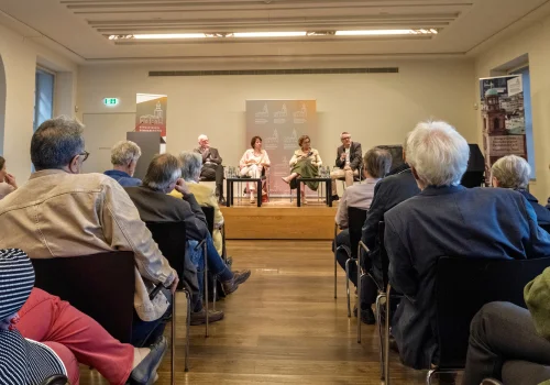 Podiumsdiskussion im Historischen Museum Frankfurt mit Prof. Christoph Mäckler, Deutsches Institut für Stadtbaukunst, Till Schneider, schneider + schumacher architekten, Frankfurt am Main, Bettina M. Wiesmann MdB.